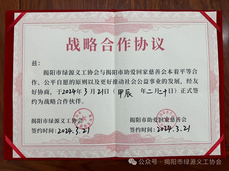 3月21日,揭阳市绿源义工协会与揭阳市助爱回家慈善会在乔林(揭阳)国际装饰材料城正式签署战略合作协议。双方将携手共进,为揭阳市慈善事业的蓬勃发展注入新动力,为需要帮助的群体送去温暖与关爱。此次双方签署战略合作协议,旨在实现慈善资源共享、优势互补,共同推动揭阳市慈善事业的发展。